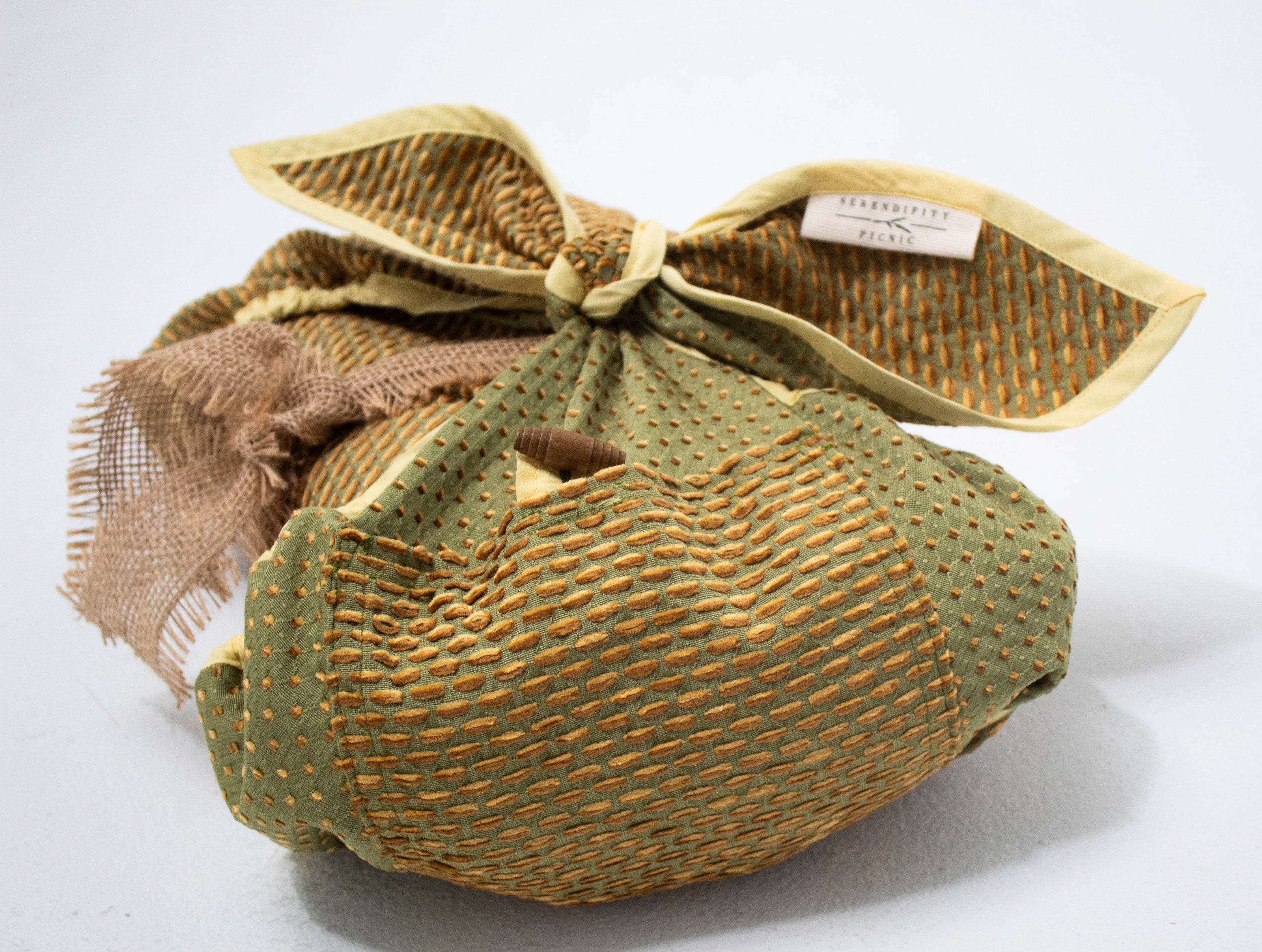 Your handcrafted Serendipity Picnic BlanKIT allows you to wrap up your favorite meats and cheeses, sandwiches, veggies, dried fruits, nuts and more in the reusable beeswax food wraps, recyclable blooming origami boxes and jars. Don’t forget your wine in the insulated thermos. Add other special items in the side pockets. Tie your Serendipity Picnic blanKIT in its beautiful signature bow and you're ready to go!